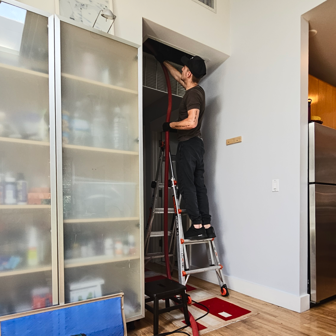 Similarly, we detach the dryer vent to clean out the duct and the outside exhaust vent with the proper agitation devices, vacuuming out all trapped lint.